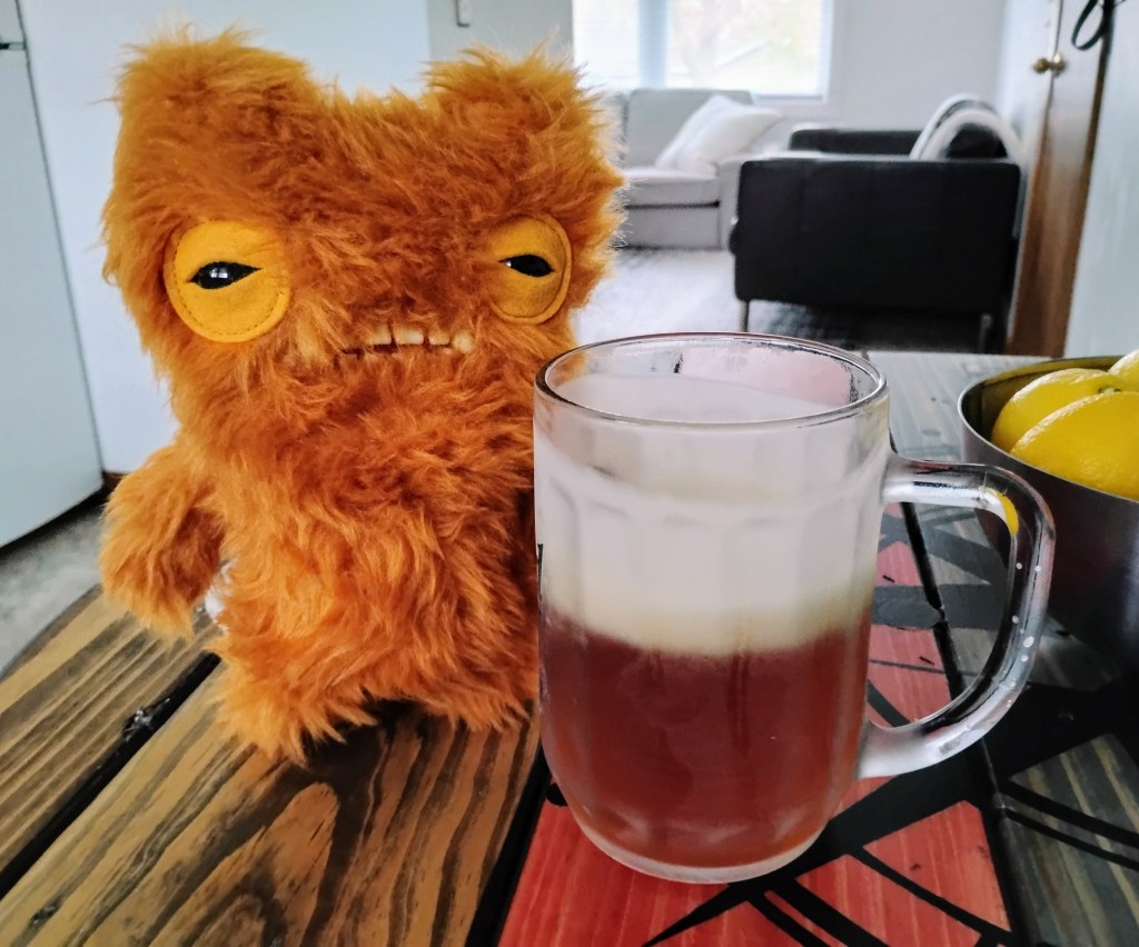 And then the best part, the part where I knew that I had landed with a good person who knew how to take care of me. The girl got a mug from the freezer and poured me a cold beer. A beer! How many other Fugglers can say they got a beer on their first day of adopted life? I mean, some of them never get out of their boxes, I’m told! And I got a frothy Rebel Kent Amber Ale from 3 Sheeps Brewing — a craft beer, nonetheless.