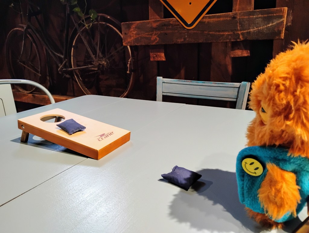 The owners told us that the Brewhouse had only been in business for a few months even though the building was historic, and they told us we should explore the upstairs before we left. Up there we found a sack toss game that I tried out before we left for home.