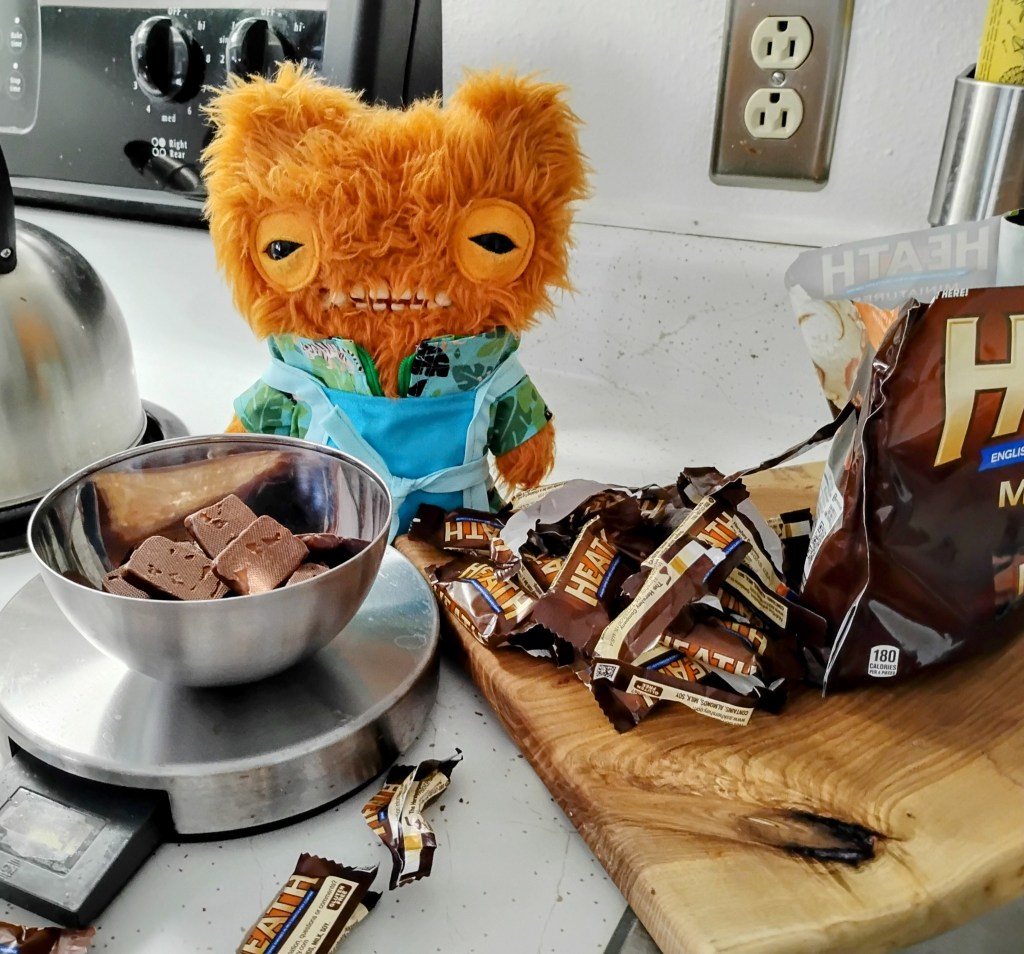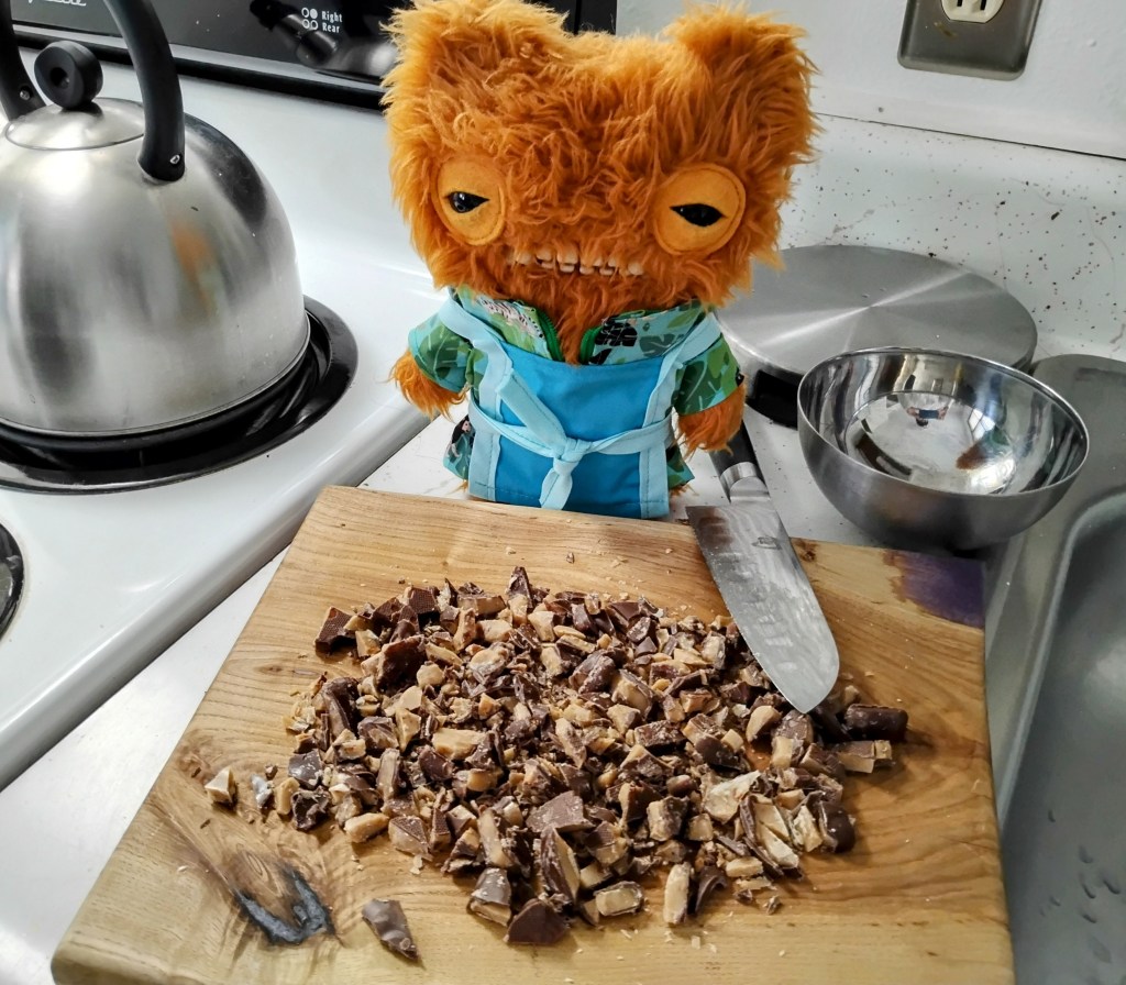 Just like with the Butterscotch Blondies I made before, the book told us to use Heath bars. This time the girl found little ones at Menards so we didn’t have to make a substitution.